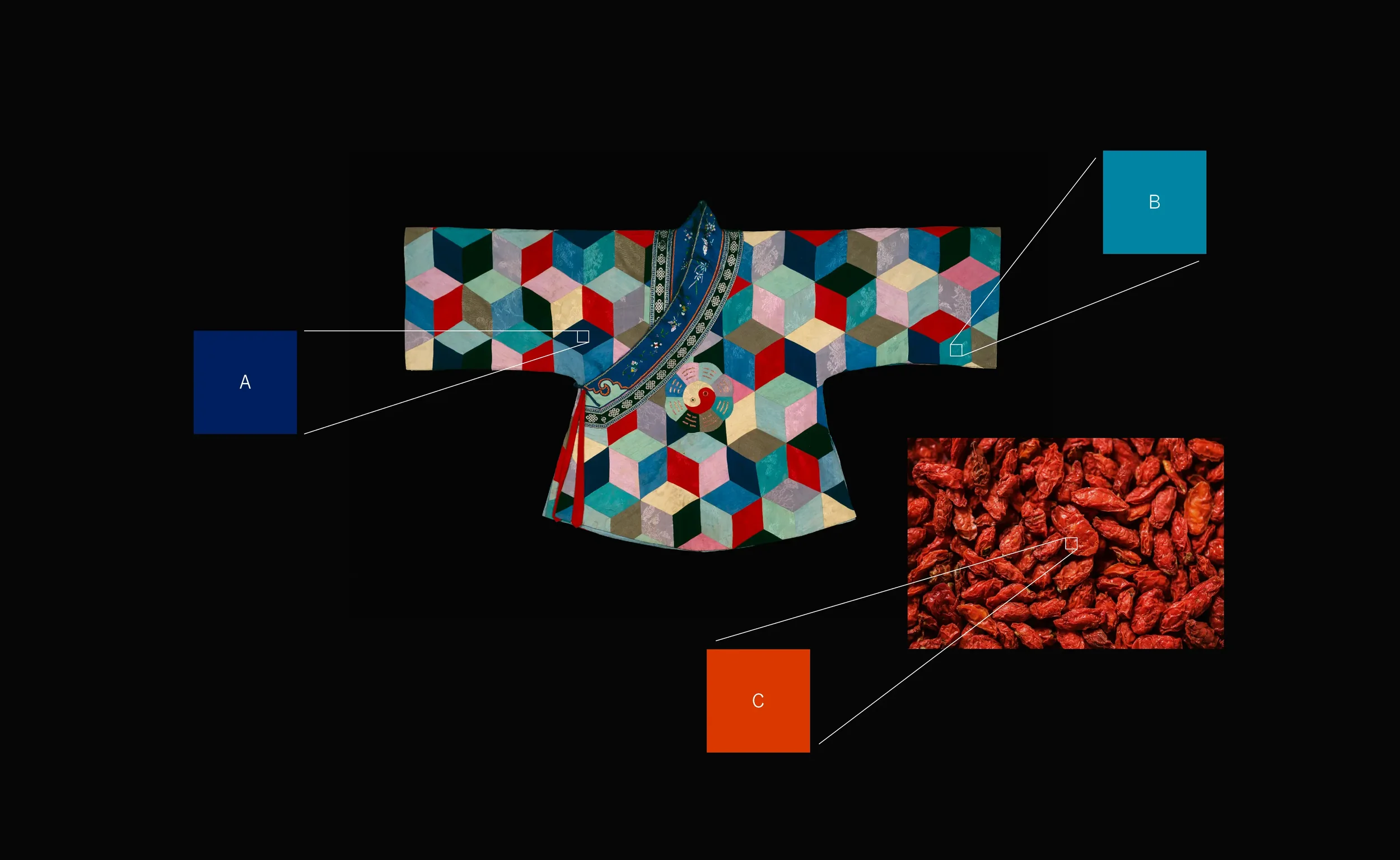 These tones are informed by cultural references, including a Qing dynasty baijia pao (“one hundred household robe”), where layered blues and teals create harmony, alongside traditional herbal ingredients that bring warmth and vitality to the palette.