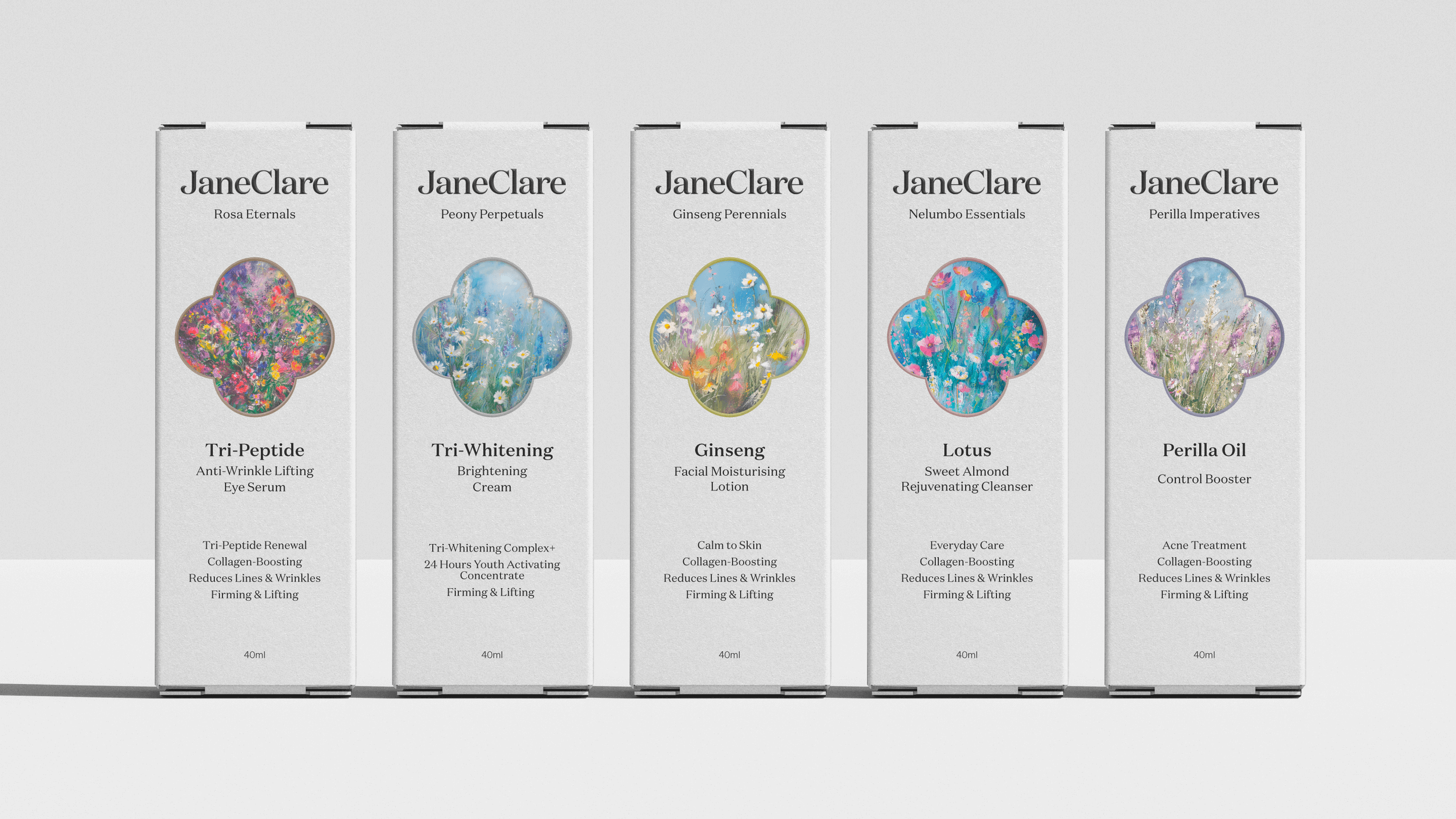 This refined packaging system communicates JaneClare’s unique positioning—combining traditional wisdom with modern science in truly natural skincare formulations.